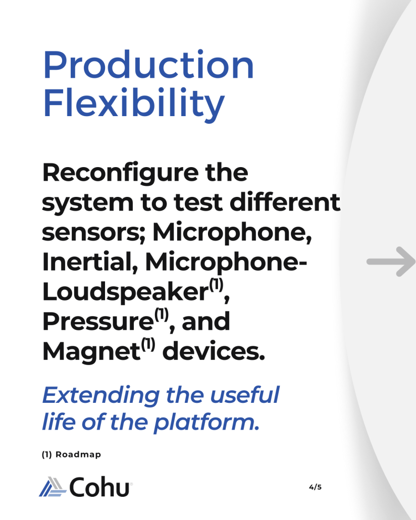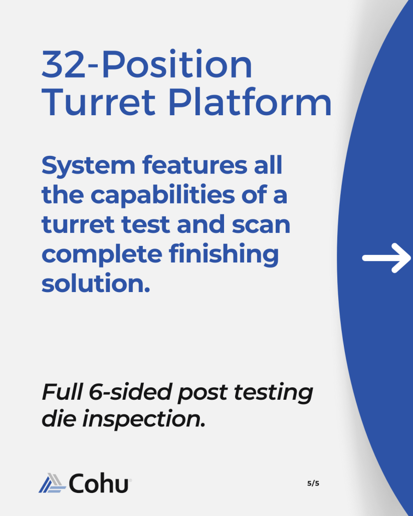 Sense+ system is designed for different MEMS & Sensor applications including inertial, microphone, microphone-loudspeaker(1), pressure(1), and magnet(1). The stimulus module can be used as a standalone unit for engineering or for low volume manufacturing with the possibility of later upgrading to a full production system. The Sense+ system offers all the flexibility of Cohu’s Turrets for loading from Wafer, Tray, Bowl, and Tube.